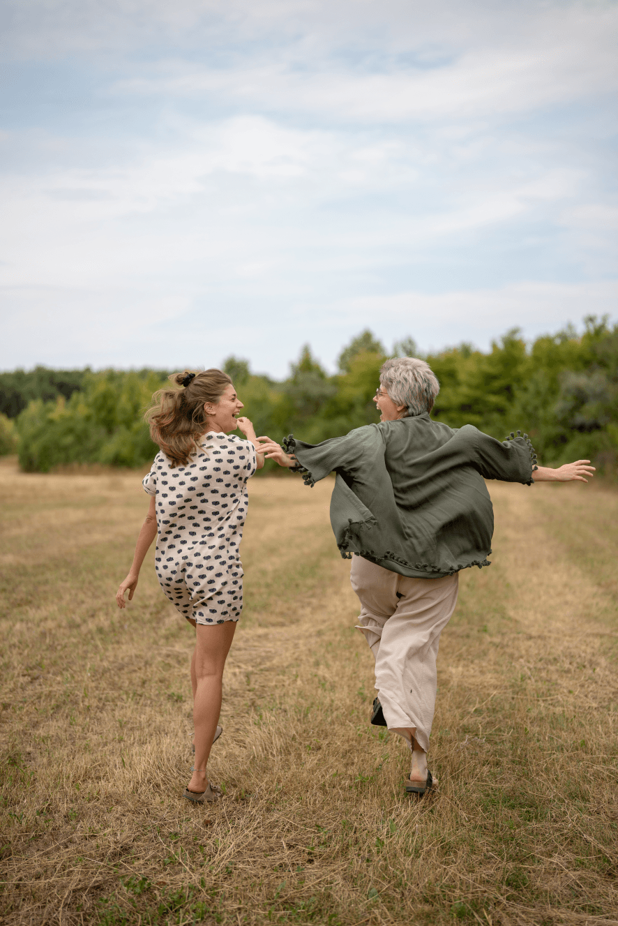 Neben den ruhigen, konzentrierten Szenen gibt es auch diese anderen Momente: gemeinsamen Lachen, ausgelassene Freude und sogar ein Herumspringen im Gras. Diese Bilder zeigen, dass Achtsamkeit und Lebensfreude Hand in Hand gehen dürfen.