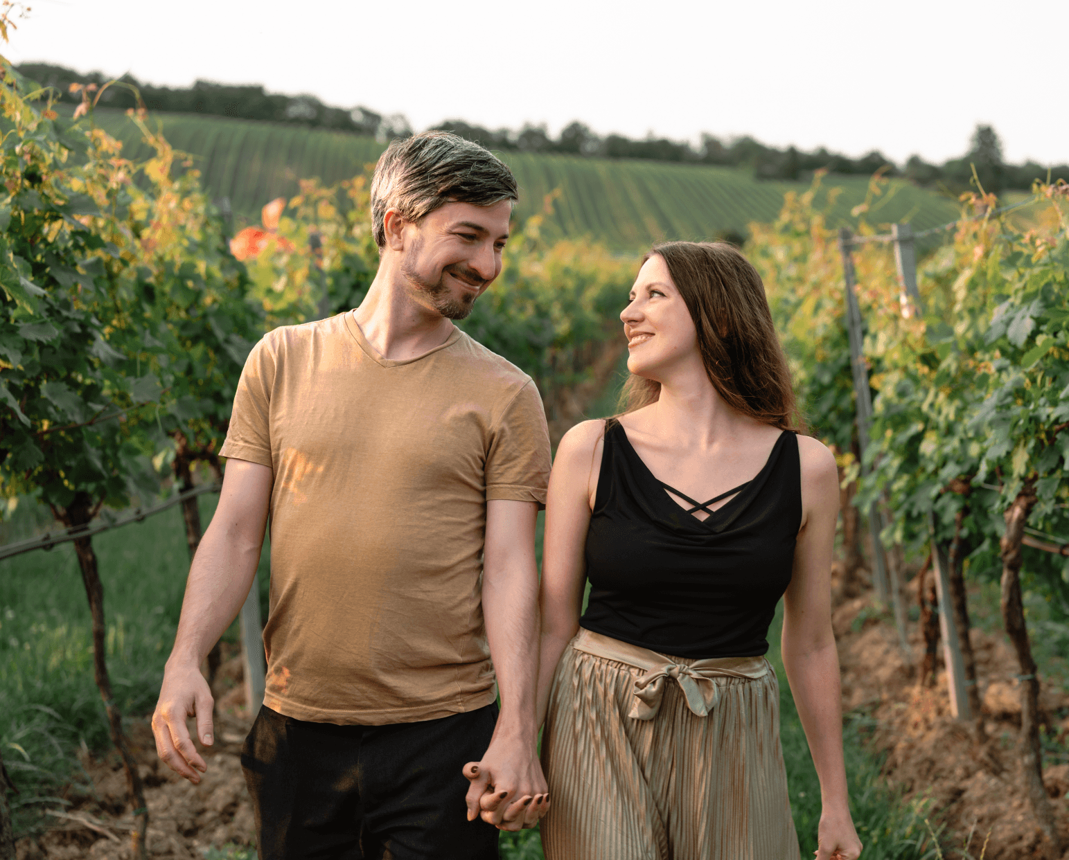 Das verliebte Paar spaziert Hand in Hand durch die Reihen, lachen laut, necken sich, bleiben stehen, um die Aussicht zu genießen. Nichts wirkt gestellt, nichts geplant – nur die Leichtigkeit und die Freude, die sich von Bild zu Bild weiterträgt.